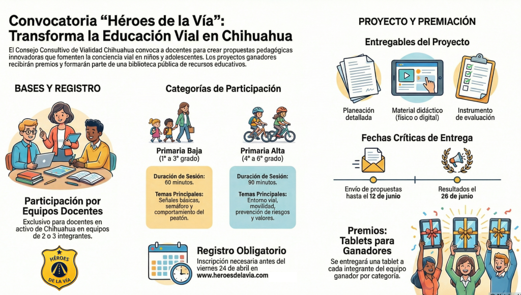 Héroes de la Vía es una iniciativa ciudadana emanada del Consejo Consultivo de Vialidad Chihuahua, desarrollada en coordinación con las autoridades correspondientes para la correcta ejecución del programa. El proyecto contempla la participación activa de estudiantes de las Escuelas Normales del Estado, la Escuela Normal Superior y la Universidad Pedagógica Nacional Unidad Chihuahua, quienes colaborarán en el diseño y creación de material didáctico especializado en educación vial para niñas, niños y adolescentes.